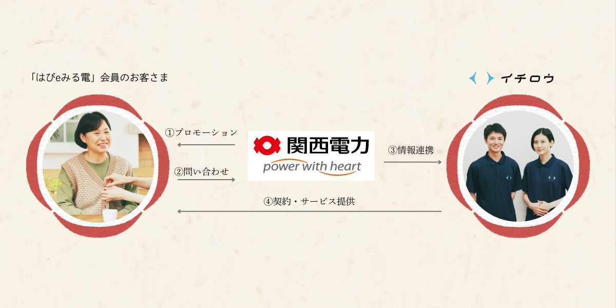 イチロウ株式会社(本社:東京都渋谷区、代表取締役:水野 友喜)は、関西電力株式会社(本社:大阪府大阪市北区、代表取締役社長:森 望)と協業を開始し、同社が提供する「はぴeみる電」会員向けのECモール「かんでん暮らしモール」において、オーダーメイド介護サービス「イチロウ」を提供いたします。「どこに頼めばよいかわからない暮らしのお困りごとを解決する!」をコンセプトとした「かんでん暮らしモール」に、24時間365日対応の介護サービスを展開するイチロウが 出店することで、より多くのお客様が必要な介護サポートを受けられる環境を整えてまいります。